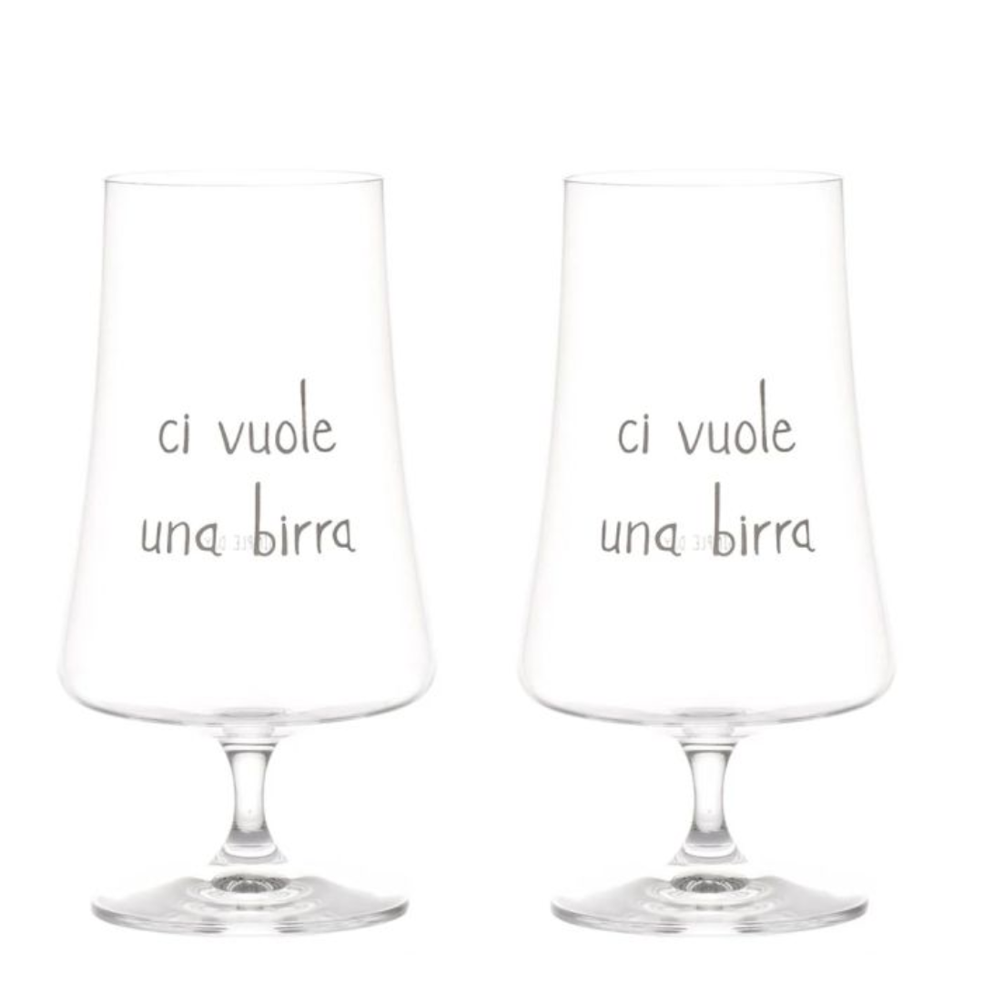 Set di due calici da birra in vetro con scritta simpatica, “bella fresca” o “ci vuole una birra”, divertente da mettere in tavola e da regalare ai tuoi amici appassionati di birra.