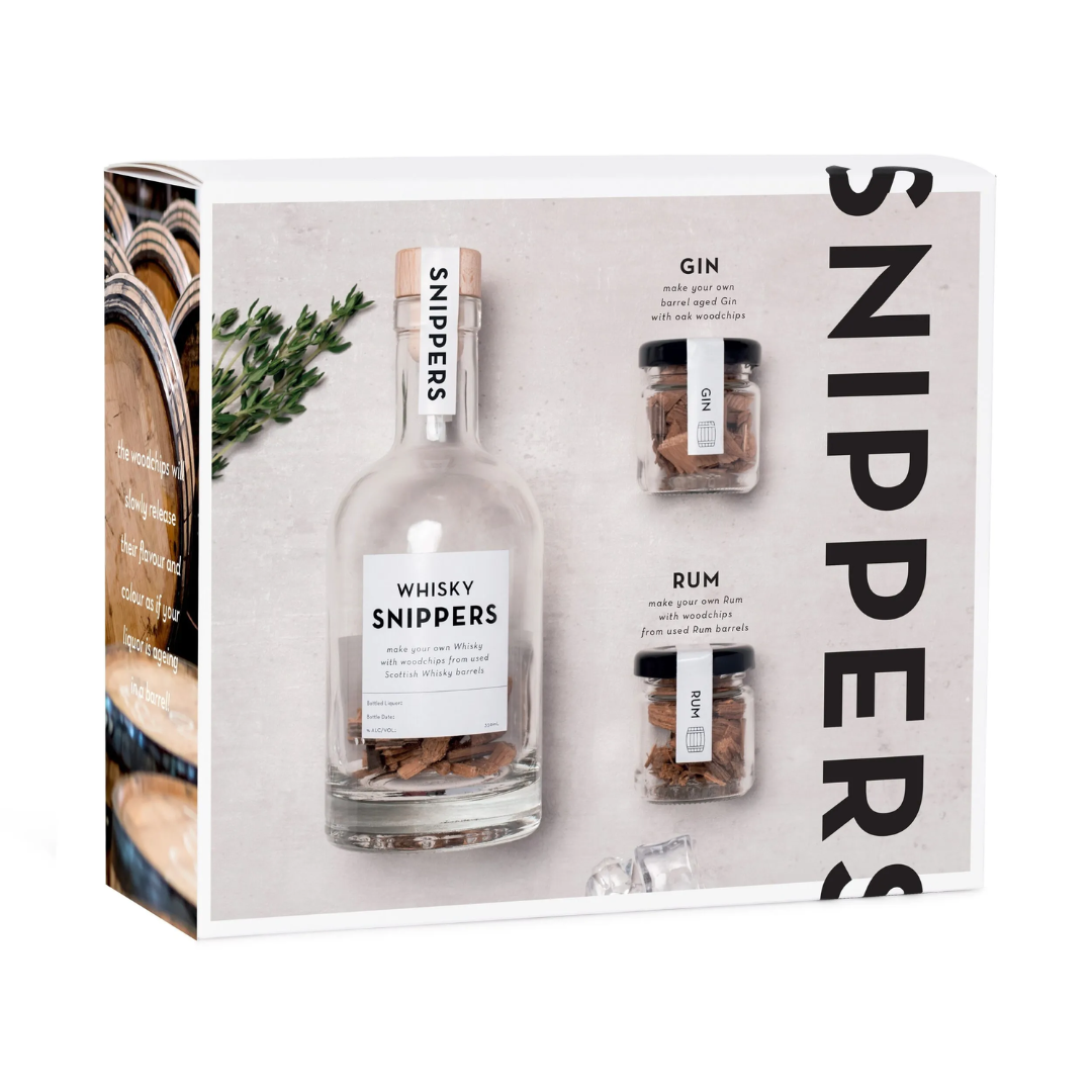 Snippers propone una collezione di bottiglie per creare da soli i propri liquori preferiti. I trucioli di legno contenuti all’interno delle bottiglie provengono dalle botti di invecchiamento dei migliori liquori. Aggiungendo semplicemente un liquore chiaro come Vodka o Dry Gin queste chips di legno rilasceranno lentamente il loro sapore e colore. Cosí dopo aver tenuto la bottiglia al buio per almeno 8 settimane otterrai un whisky, un gin, un rum come invecchiati in botte!